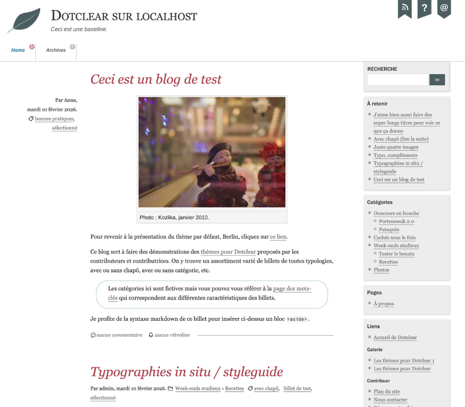 Le thème Ductile 2026 est prêt. Il fera partie de la distribution lors de la prochaine version de Dotclear, le 13 mai prochain. L’ancien Ductile sera supprimé des thèmes par défaut mais restera dans les thèmes disponibles sur votre installation. Libre à vous d’activer le nouveau via « Apparence du blog » ou de rester sur l’ancien.