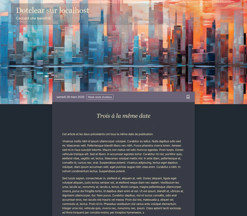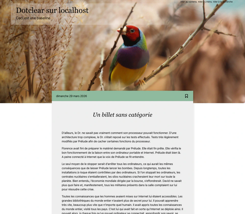 Pour voir le thème en action, choisissez Adèle dans le menu Changer de thème ou cilquez sur ce lien. Pour le voir en mode sombre, actionnez le bouton correspondant dans le menu Mode clair/sombre. Merci de me faire part des anomalies que vous pourriez rencontrer ou vos suggestions d’amélioration.